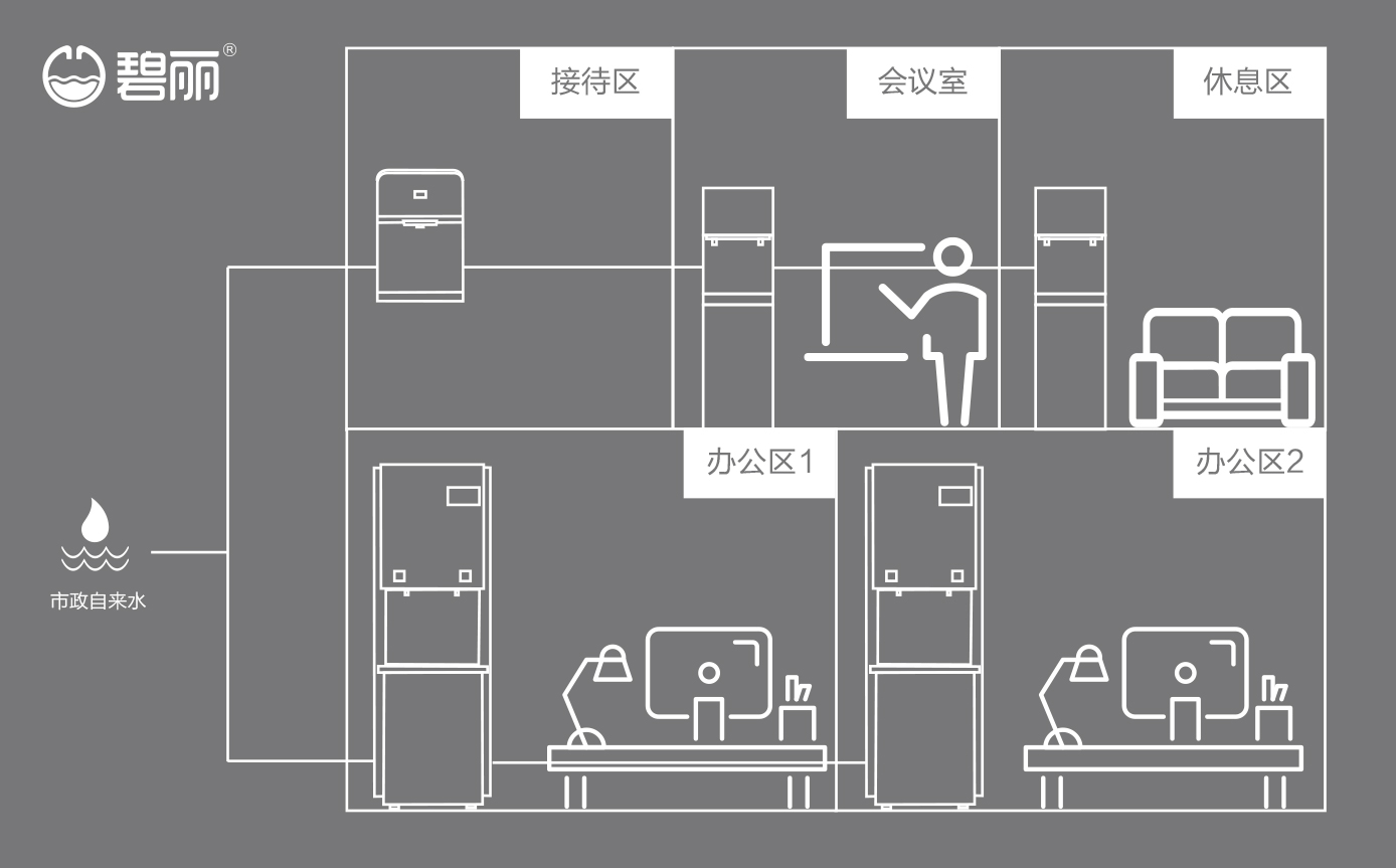 碧麗商用反滲透純水機將自來水集中處理后,把優(yōu)質(zhì)的純凈水通過專用的供水管道輸送到各飲水點;